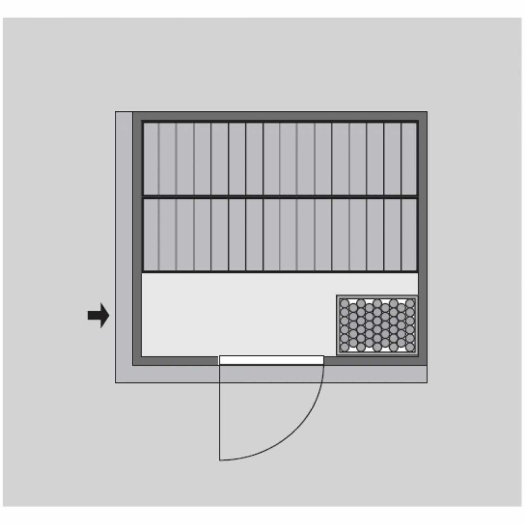A szaunának nincs saját padlója, kizárólag megfelelő padlóburkolattal, ideális esetben járólappal ellátott helyiségben kell elhelyezni. A szaunát mennyezeti párkány (profil) nélküli kivitelben szállítjuk, 3 x 7,5 W LED világítással.
