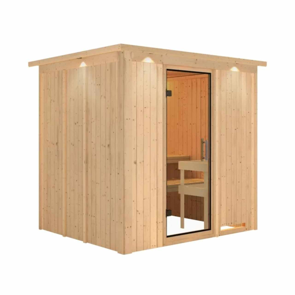 Ez a fajta finn szauna legfeljebb két fő részére lett tervezve. Ezt a finn szaunamodellt egy ház vagy lakás temperált belső teréhez tervezték. Méretek sz 196 x mé 170 x ma 198 cm. Gyártójának, a németországi Brémából származó KARIBU HOLZTECHNIK cégnek sikerült termékeivel sikeresen tovább vinnie a skandináv szaunák évszázados hagyományait, ugyanakkor a mai modern technológiákat is beépítette. A szauna teljes egészében északi lucfenyőből készült, természetes kivitelben. A fa Európa északi részéből származik, és teljesen vegyszeresen kezeletlen (sem nem festett, sem nem lakkozott). Ennek eredményeként mentes minden olyan ismert problémás anyagtól, amely a szaunázás során a fából felszabadulhat. Ez a beltéri szauna kivételes hőszigetelő tulajdonságokkal rendelkezik. A szauna falai speciálisan simított, hornyolt deszkák belső és külső rétegéből állnak, amelyek között 42 mm vastag hőszigetelés található ásványgyapot formájában. A fal teljes vastagsága így 68 mm. A hátsó, vagy a szoba fala felé néző, nem látható oldal keménylemez külsővel rendelkezik. Ezért azonos hőszigetelés mellett körülbelül 10 mm-rel vékonyabbak, mint a táblákkal borított nézeti oldalak.