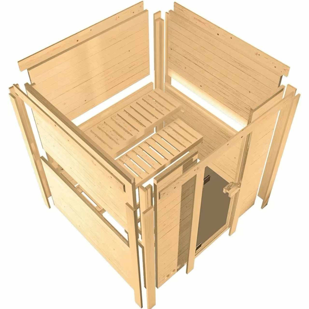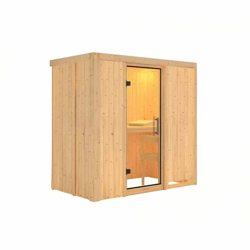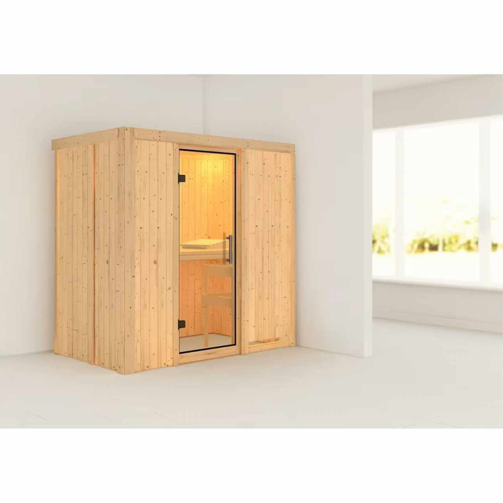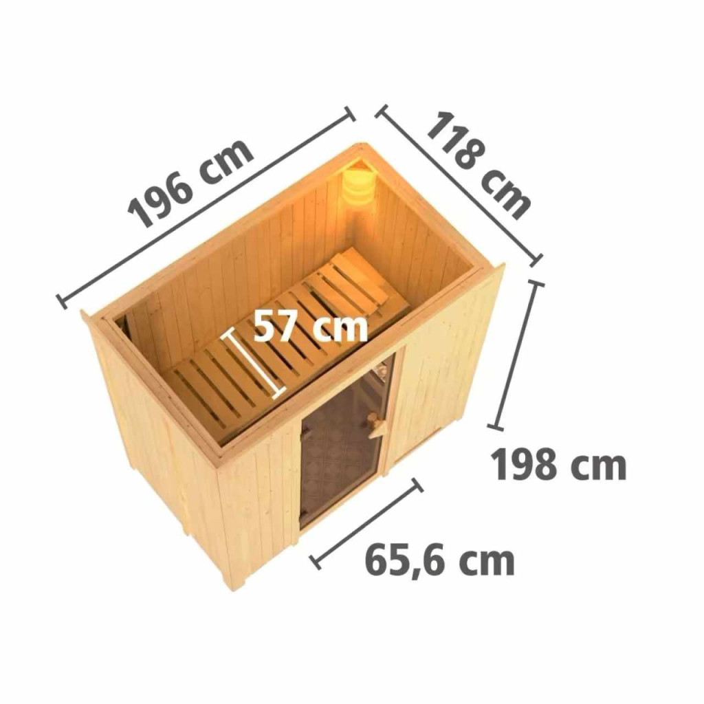 Ez a fajta finn szauna legfeljebb két fő részére lett tervezve. Ezt a finn szaunamodellt egy ház vagy lakás temperált belső teréhez tervezték. Méretek sz 196 x mé 118 x ma 198 cm. Gyártójának, a németországi Brémából származó KARIBU HOLZTECHNIK cégnek sikerült termékeivel sikeresen tovább vinnie a skandináv szaunák évszázados hagyományait, ugyanakkor a mai modern technológiákat is beépítette. A szauna teljes egészében északi lucfenyőből készült, természetes kivitelben. A fa Európa északi részéből származik, és teljesen vegyszeresen kezeletlen (sem nem festett, sem nem lakkozott). Ennek eredményeként mentes minden olyan ismert problémás anyagtól, amely a szaunázás során a fából felszabadulhat. Ez a beltéri szauna kivételes hőszigetelő tulajdonságokkal rendelkezik. A szauna falai speciálisan simított, hornyolt deszkák belső és külső rétegéből állnak, amelyek között 42 mm vastag hőszigetelés található ásványgyapot formájában. A fal teljes vastagsága így 68 mm. A hátsó, vagy a szoba fala felé néző, nem látható oldal keménylemez külsővel rendelkezik. Ezért azonos hőszigetelés mellett körülbelül 10 mm-rel vékonyabbak, mint a táblákkal borított nézeti oldalak.