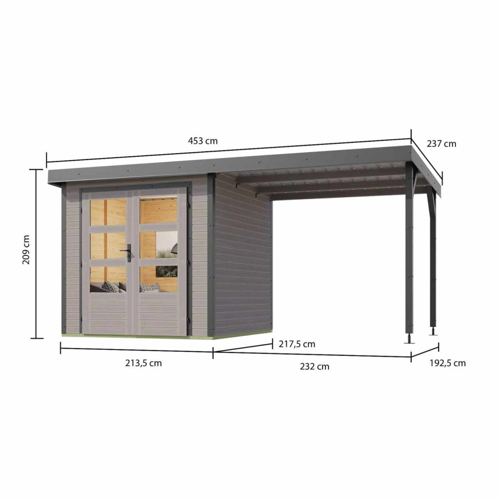 Ezt a házmodellt professzionális KARIBU festékben szállítjuk (világosszürke RAL 360 60 05 árnyalat):