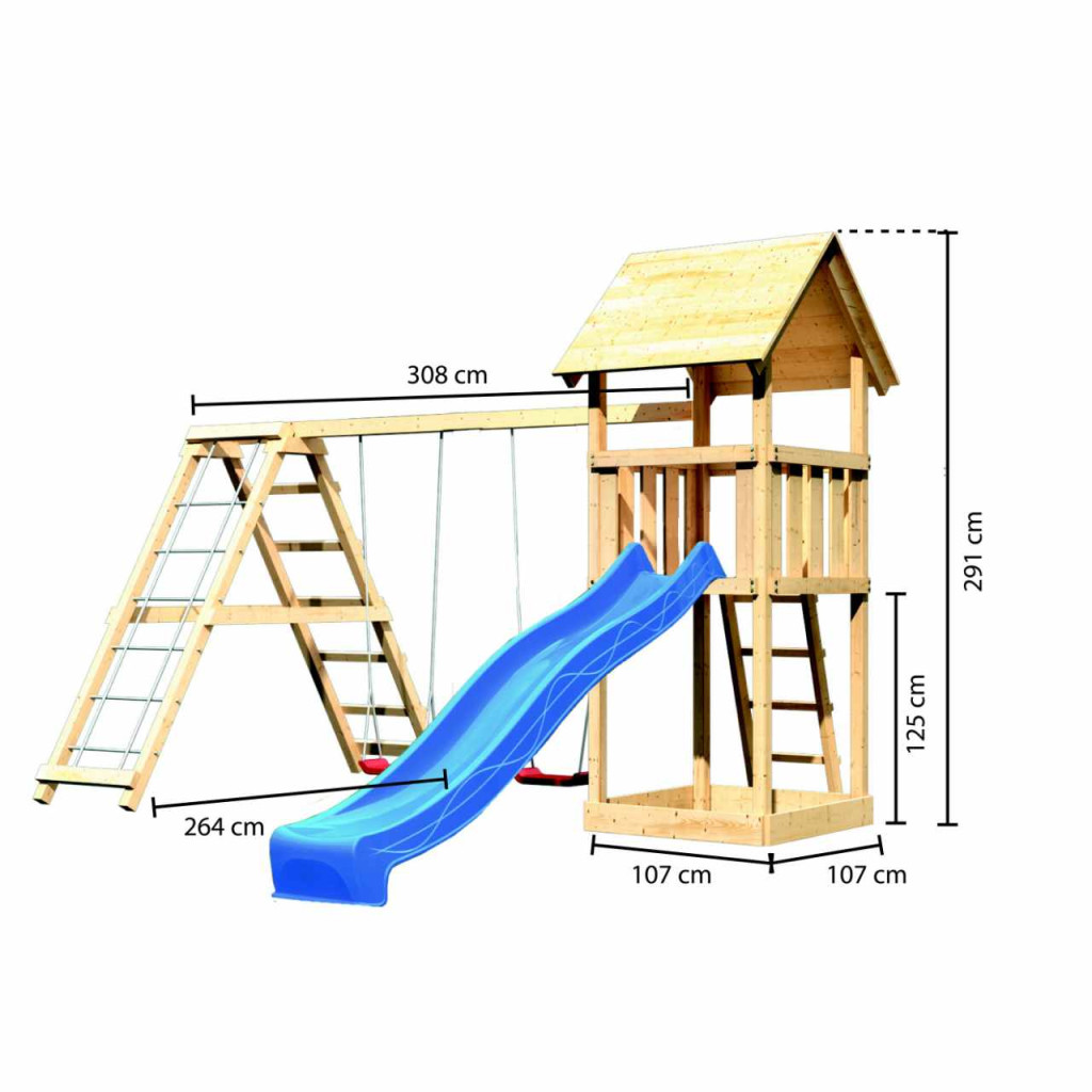 Játszótér, külső méretek sz 107 x h 107 x ma 291 cm, kék csúszdával, hintával és létrával.