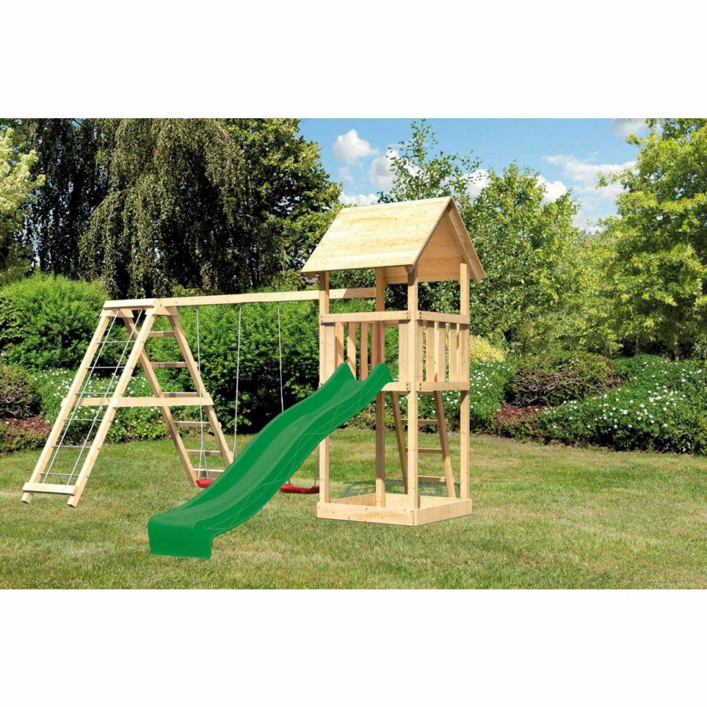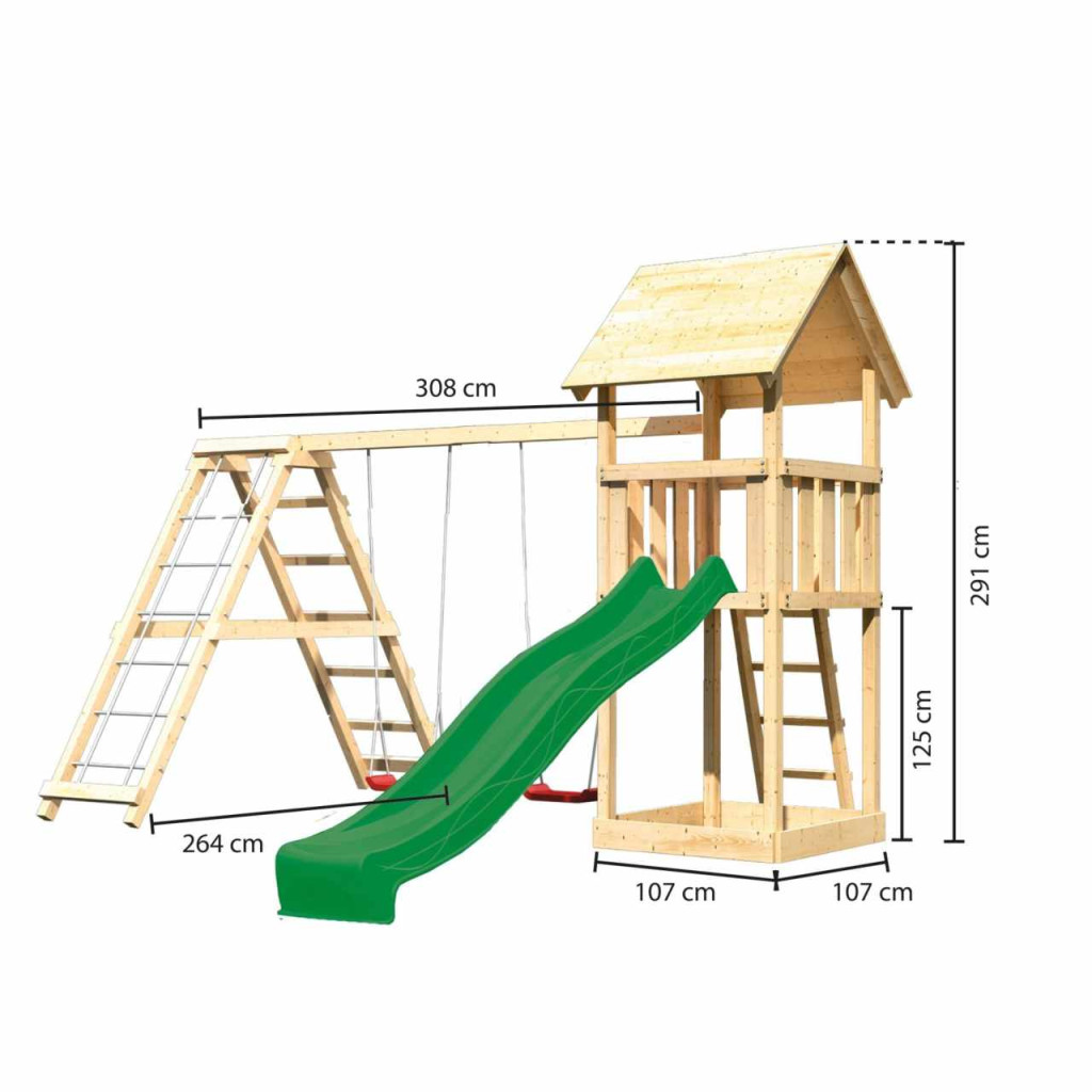 A KARIBU LOTTI játszótér rengeteg játéklehetőséget biztosít a gyerekeknek. Mindent kínál a gyerekeknek, hogy kiélhessék játékfantáziájukat. Mint minden játszóterünknél, a KARIBU LOTTI modellhez is csak a legjobb lucfát használjuk. A játszótér 68 x 68 mm vastagságú tartóoszlopokkal rendelkezik, és 18 mm vastagságú faprofilból készül (hézagok a nyelv/horony rendszerben). Fánk Európa távoli északi részeiről származik, és vegyileg teljesen kezeletlen. Ennek eredményeként mentes minden ismert problémás anyagtól. A 125 cm-es platformmagasságnak köszönhetően a KARIBU LOTTI játszótér tökéletes kilátást nyújt a gyerekeknek a kertre. A játszótér alapfelszereltsége egy robusztus, 4 fokos fa létra és egy homokozó a torony alatt. Természetesen a KARIBU LOTTI játszótér rendelkezik a DIN EN 71-1, DIN EN 71-3, DIN EN 71-8 és AfPS GS 2014 szerinti TÜV Nord termékbiztonsági tanúsítvánnyal (GS).