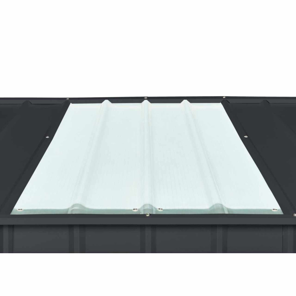 Ez a GLOBEL kerti ház a tetőn található egyedi ablakban különbözik a hagyományos kerti házaktól. A tető beépített ablaka úgy van kialakítva, hogy a tető egyik fémlemez részét felváltja egy üvegszálból készült, méretben azonos alkatrész. A tetőablaknak köszönhetően rengeteg fény van a házban.