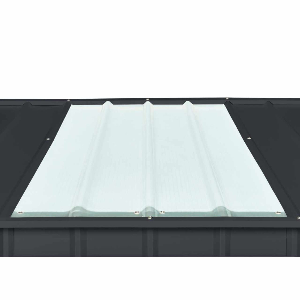 Ez a GLOBEL kerti ház a tetőn található egyedi ablakban különbözik a hagyományos kerti házaktól. A tető beépített ablaka úgy van kialakítva, hogy a tető egyik fémlemez részét felváltja egy üvegszálból készült, méretben azonos alkatrész. A tetőablaknak köszönhetően rengeteg fény van a házban.