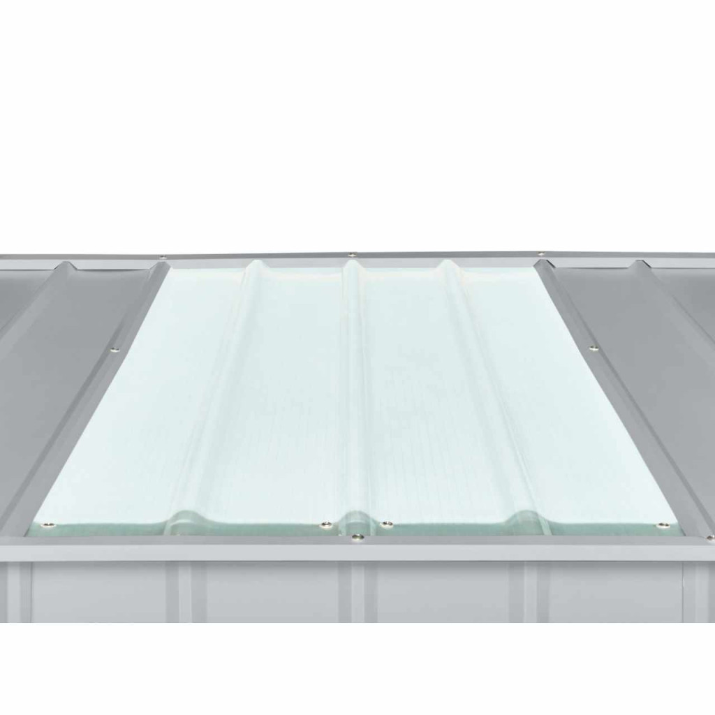 Ez a GLOBEL kerti ház a tetőn található egyedi ablakban különbözik a hagyományos kerti házaktól. A tető beépített ablaka úgy van kialakítva, hogy a tető egyik fémlemez részét felváltja egy üvegszálból készült, méretben azonos alkatrész. A tetőablaknak köszönhetően rengeteg fény van a házban.