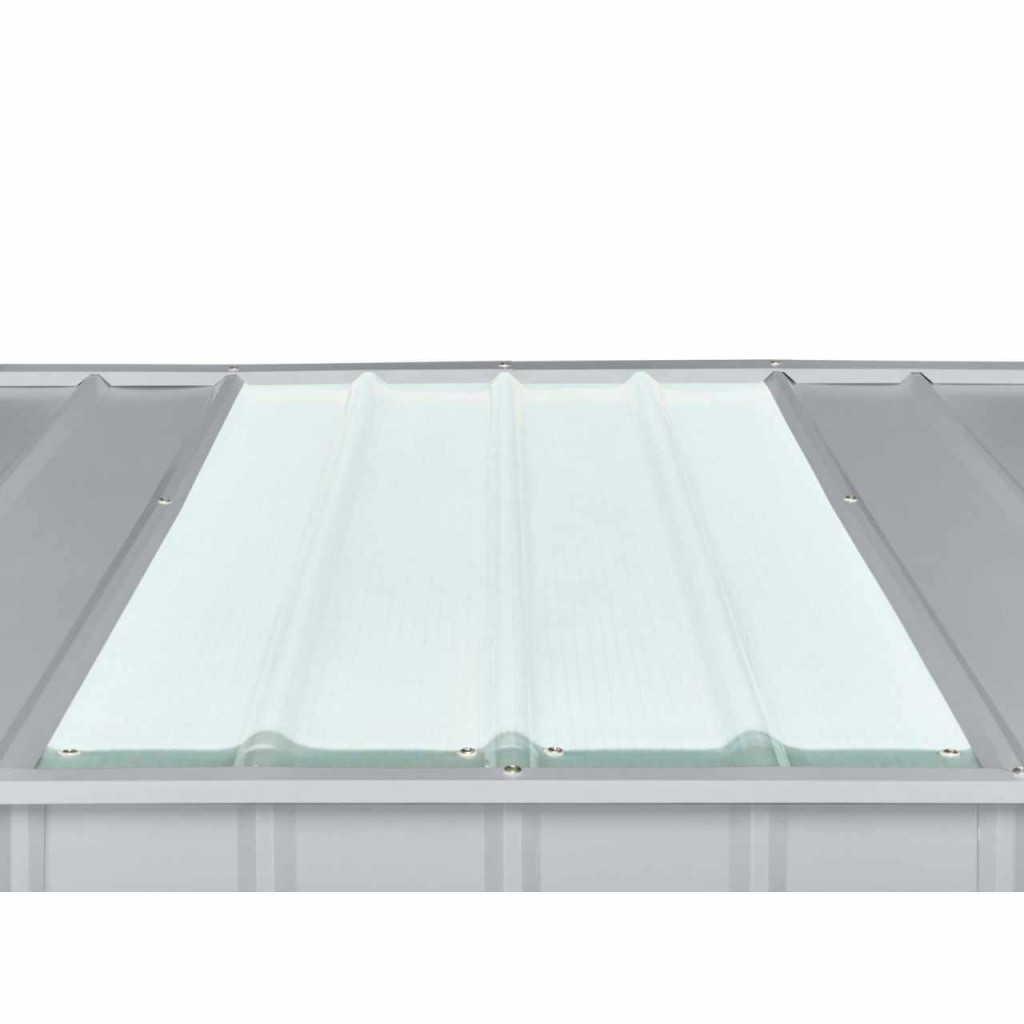 Ez a GLOBEL kerti ház a tetőn található egyedi ablakban különbözik a hagyományos kerti házaktól. A tető beépített ablaka úgy van kialakítva, hogy a tető egyik fémlemez részét felváltja egy üvegszálból készült, méretben azonos alkatrész. A tetőablaknak köszönhetően rengeteg fény van a házban.