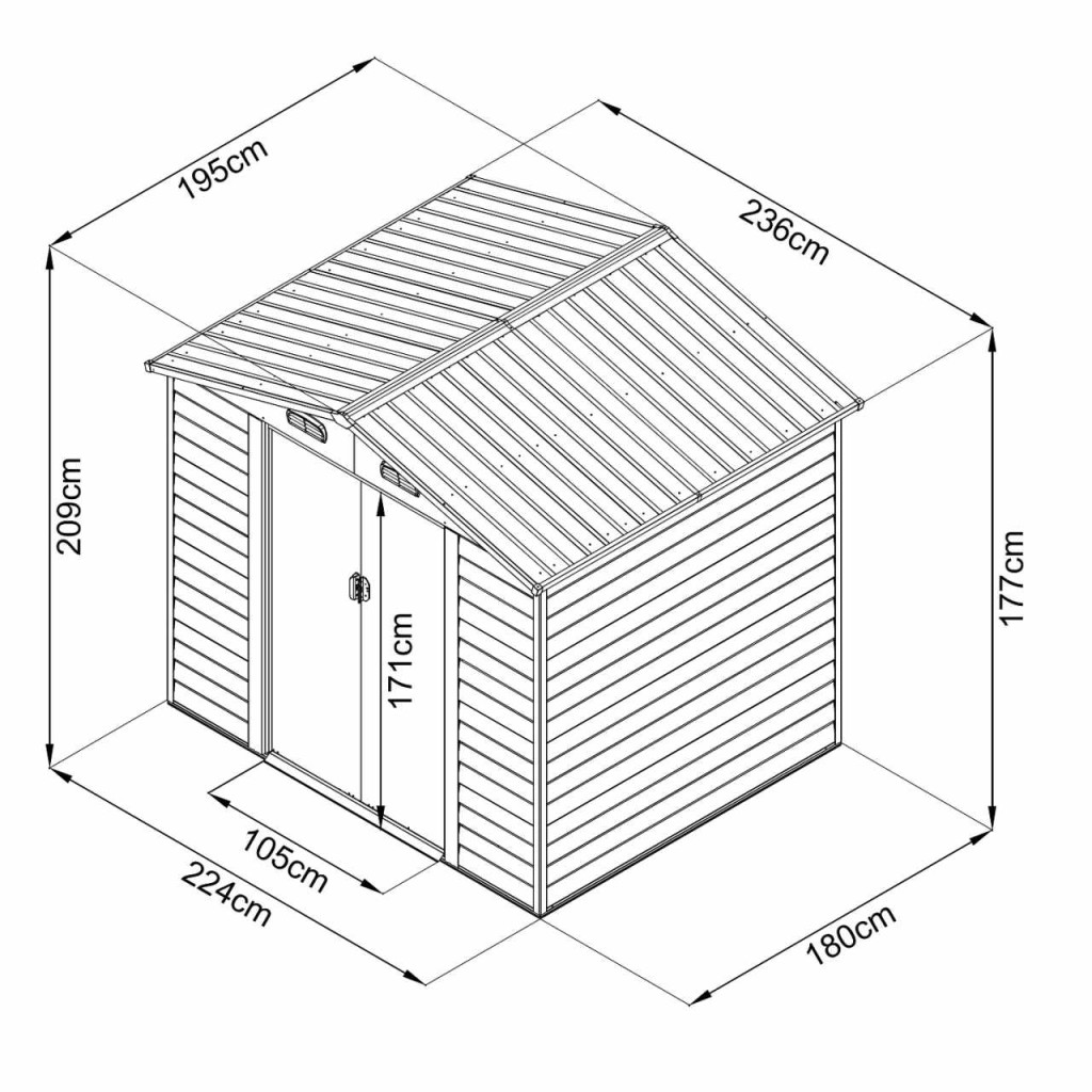A kerti ház vízszintesen profilozott lemezből készül, és vizuálisan (kialakítása és színe) közel van egy faházhoz. A kerti ház alkalmas a kerti, sport, medence, grill, kemping, motor, és más tartozékok tárolásához. A cseh piac egyik legjobb minőségű házikója, 0,25 mm vastagságú falpanel vastagsággal. Modern design, szín, egyszerű összeszerelés, egész évben használható. Minőségi anyag, kiváló minőségű felület kezelés – elektrolitikusan horganyzott lemez, hővel felvitt festék. Nyeregtető, elülső toló ajtó. Lehetőség van az ajtó bezárhatására (a csomag nem tartalmazza a zárat).