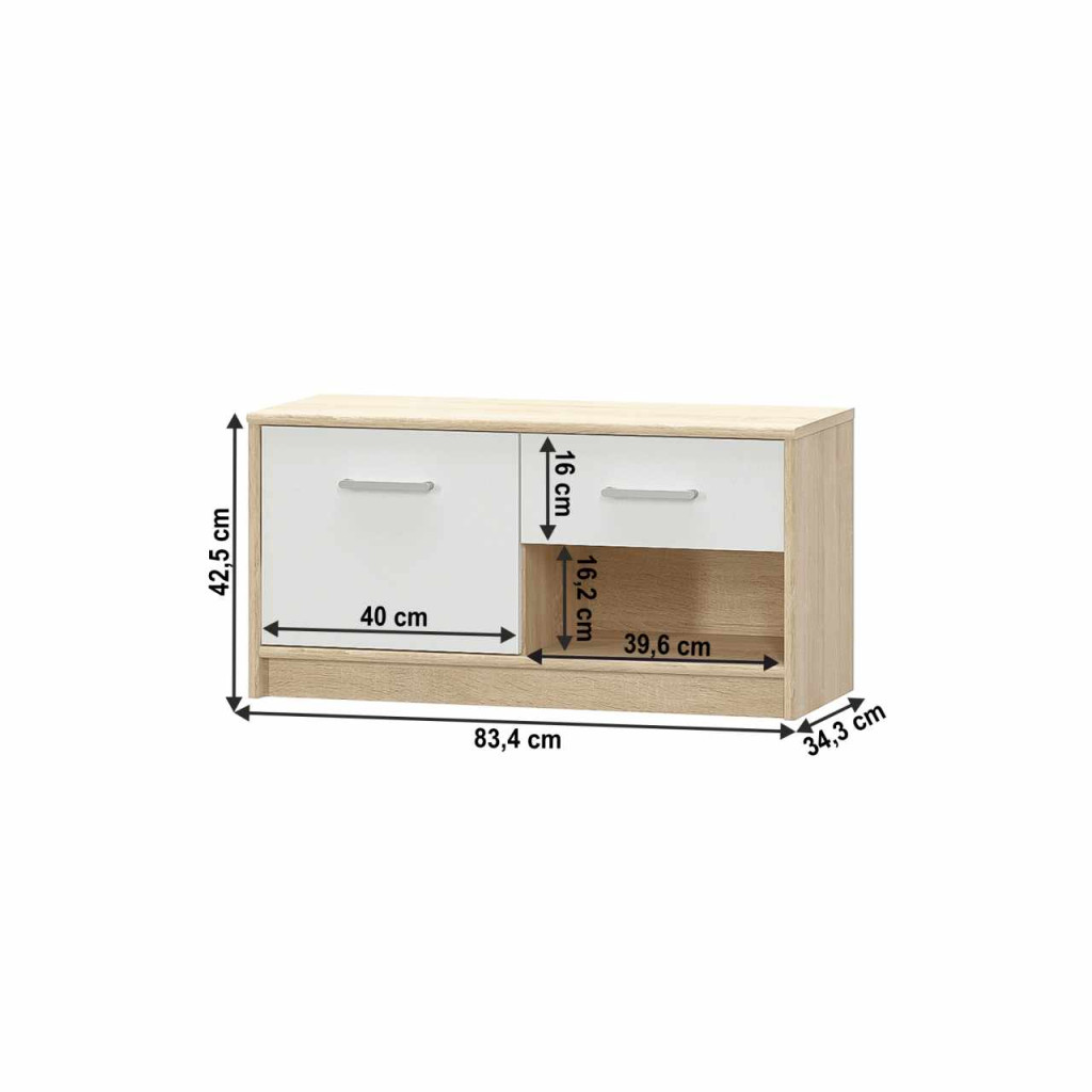 Jomód 1D1S TEYO Anyag: laminált DTD Színváltozat: fehér/sonoma tölgy Méretek(SzxMéxMa): 83,4x34,3x42,5 cm Anyagvastagság: 16 mm Szállítás szétszerelve.
