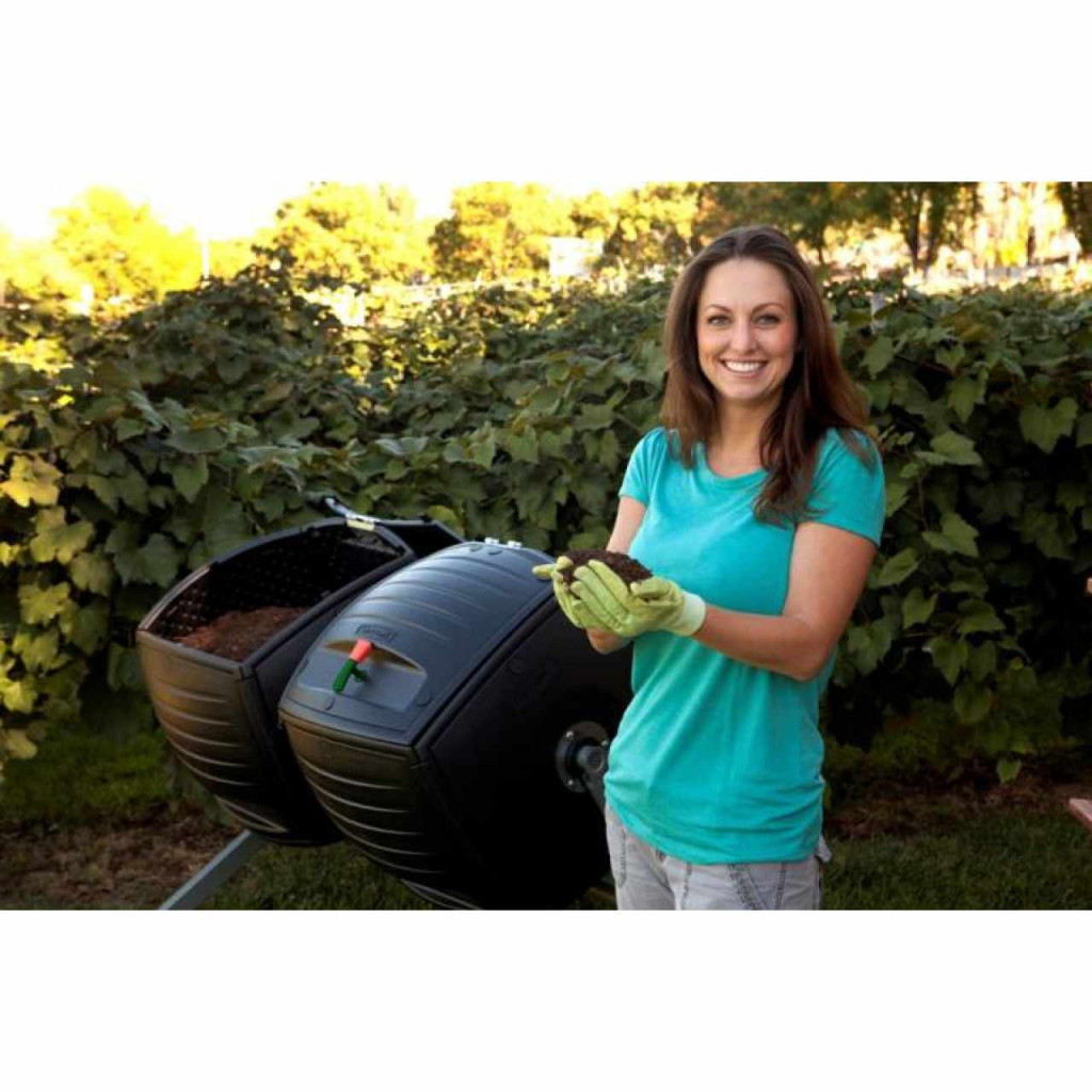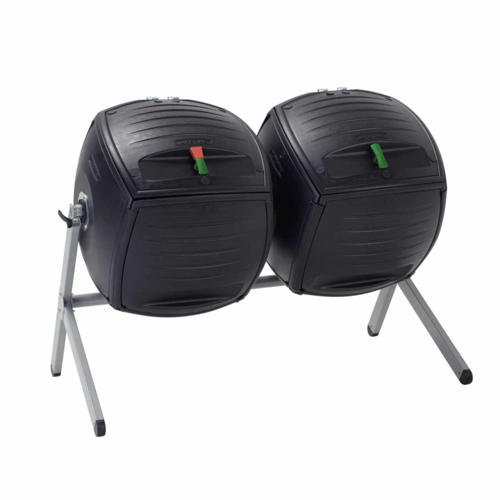 Kétdobos forgó komposztáló könnyű komposztálás alatt a kertben. A komposztáló formájában van két fekete henger egy dupla fal azzal a lehetőséggel, forgás egy szilárd támogató horganyzott szerkezet. A komposztáló egy bizonyos helyzetben rögzítéssel rögzíthető. Mi a kínálat, mint egy készlet - könnyű telepítés.