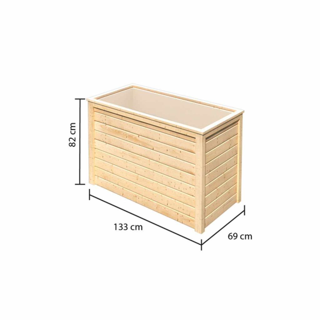 Magaságyás KARIBU, sze 133 x m 69 x ma 82 cm, fa 19 mm vastag, a virágládának nincs alja.