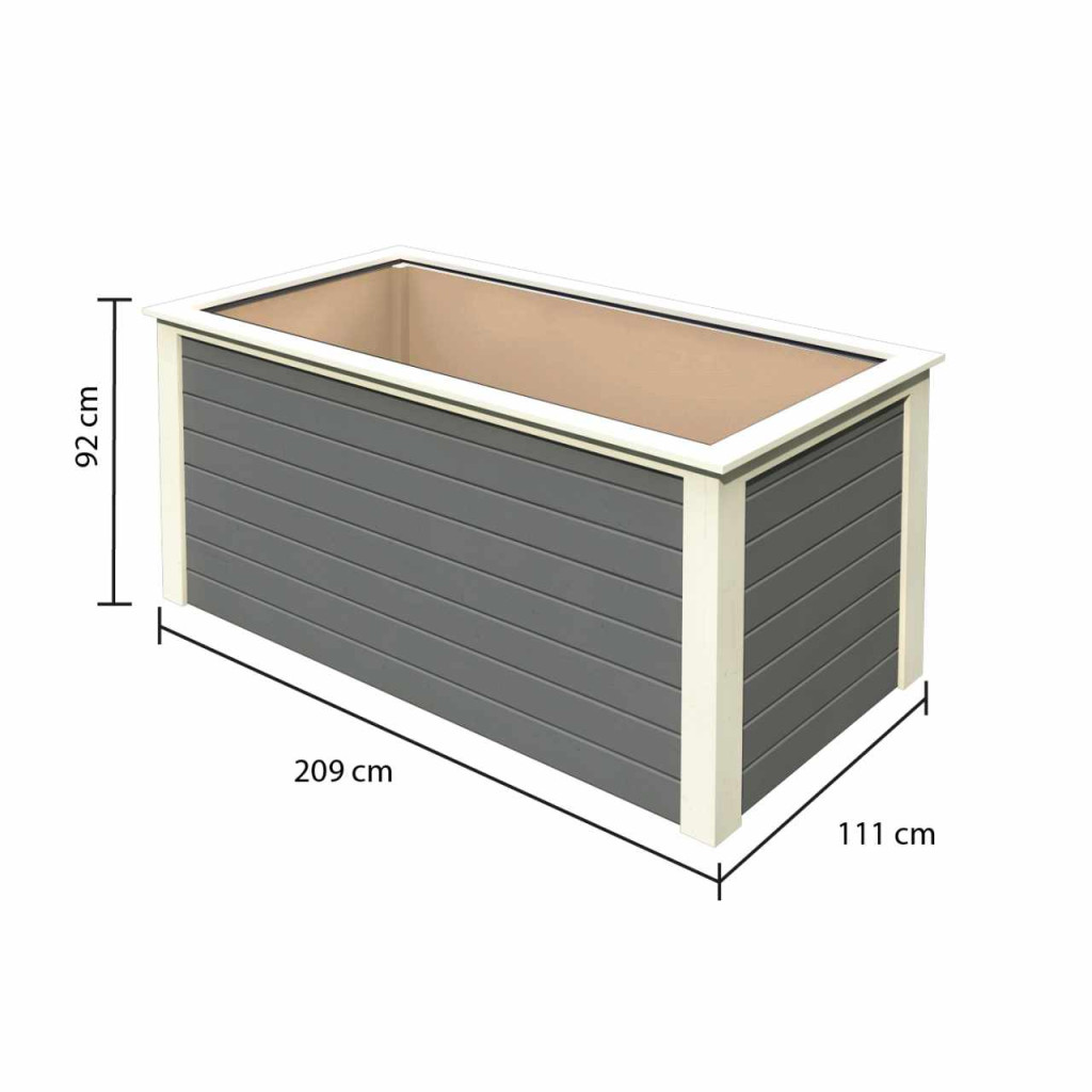 Magaságyás KARIBU, sze 209 x m 111 x ma 92 cm, fa 28 mm vastag, sötétszürke színű, a virágládának nincs alja.