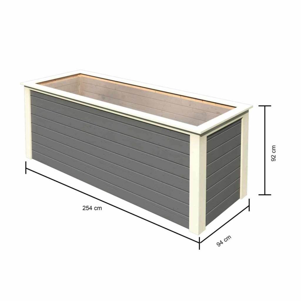 Magaságyás KARIBU, sze 254 x m 94 x ma 92 cm, fa 28 mm vastag, sötétszürke színű, a virágládának nincs alja.