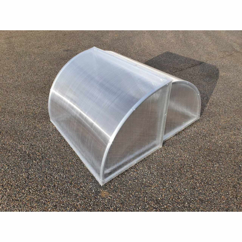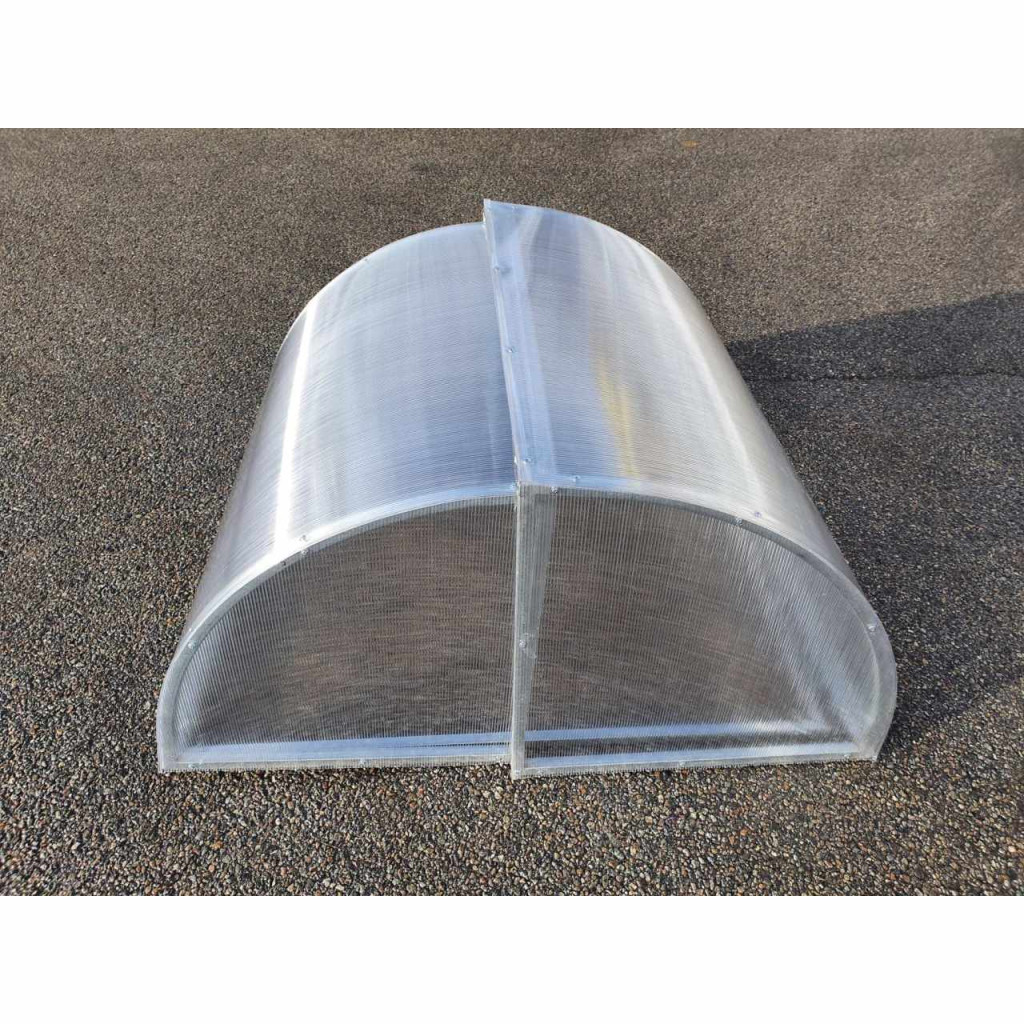 Szokatlan mini-üvegház nyitható félhenger formájában, méretei sz 105 x d 120 cm, 4 mm polikarbonát.