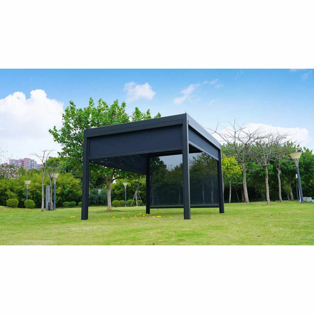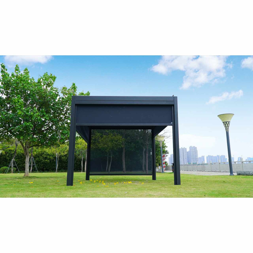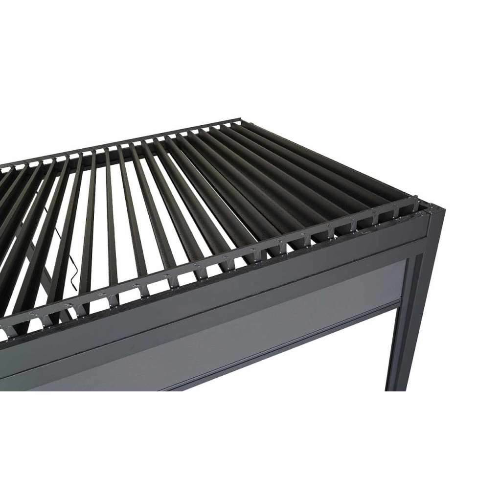 Behúzható roló a 3 m-es pergola LANITPLAST PREMIUM oldalfalához. A redőny egy felső sínből, egy rúddal a roló gurításához és két masszív függőleges vezetősínből áll a roló széleihez.