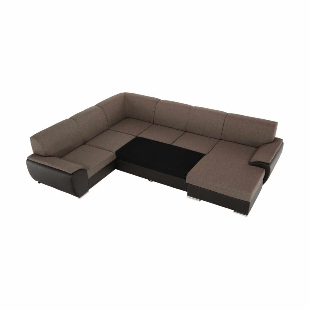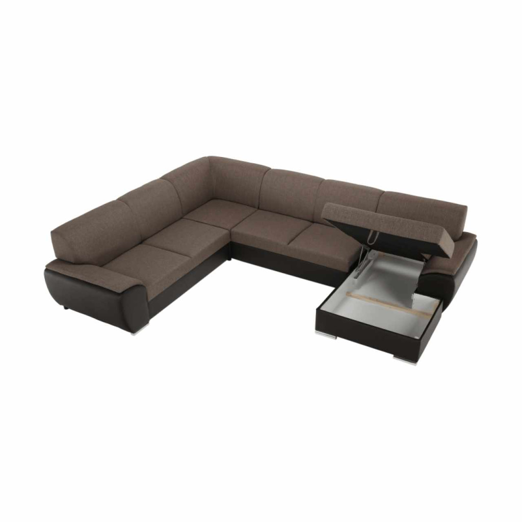 Kinyitható kárpitozott EMILY U ülőgarnitúra rakodótérrel, jobbos változat Anyag: textilbőr barna/szövet Portland 24 barna A szövet Portland kopásállósága: 52 000 Martindale A textilbőr kopásállósága: 100 000 Martindale Méretek (SzéxMaxH): 343x83x272/174 Fekvőfelület (HxSzé): 275x129 cm Az alsó tér magassága a padlótól: 5 cm Terhelhetőség: 90 kg