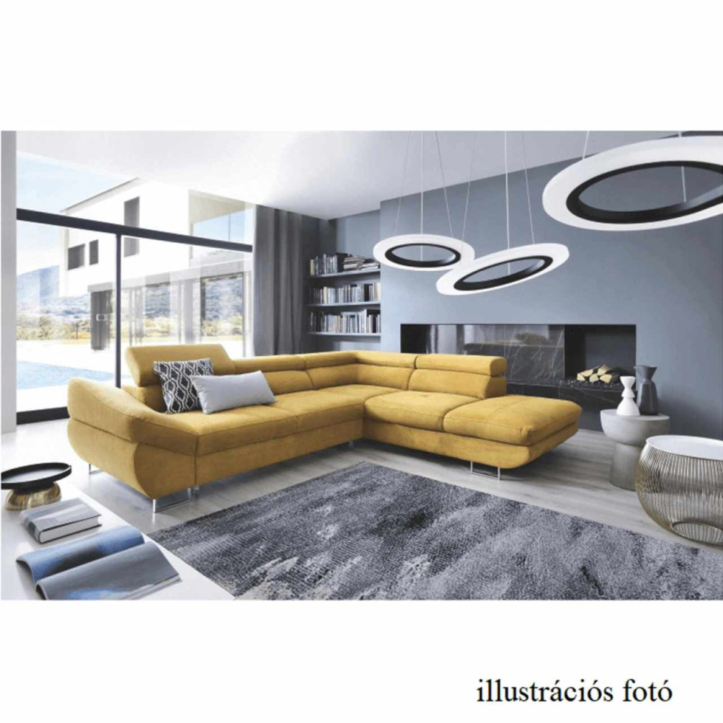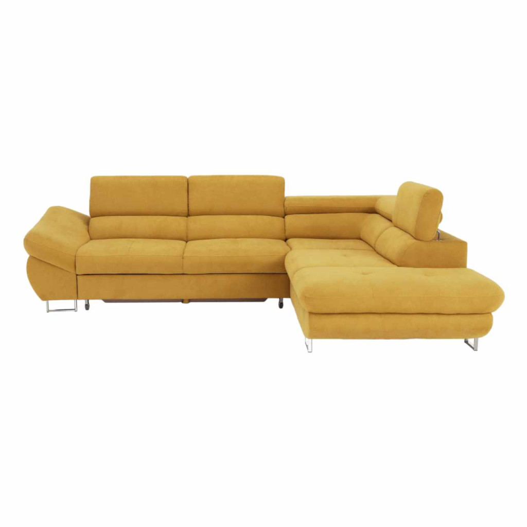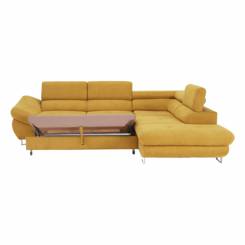 Szövetborítású sarokgarnitúra, ágyfunkcióval, ágyneműtartóval, állítható fejtámlával, jobbos kivitel, Soro 40 mustársárga, FABIA