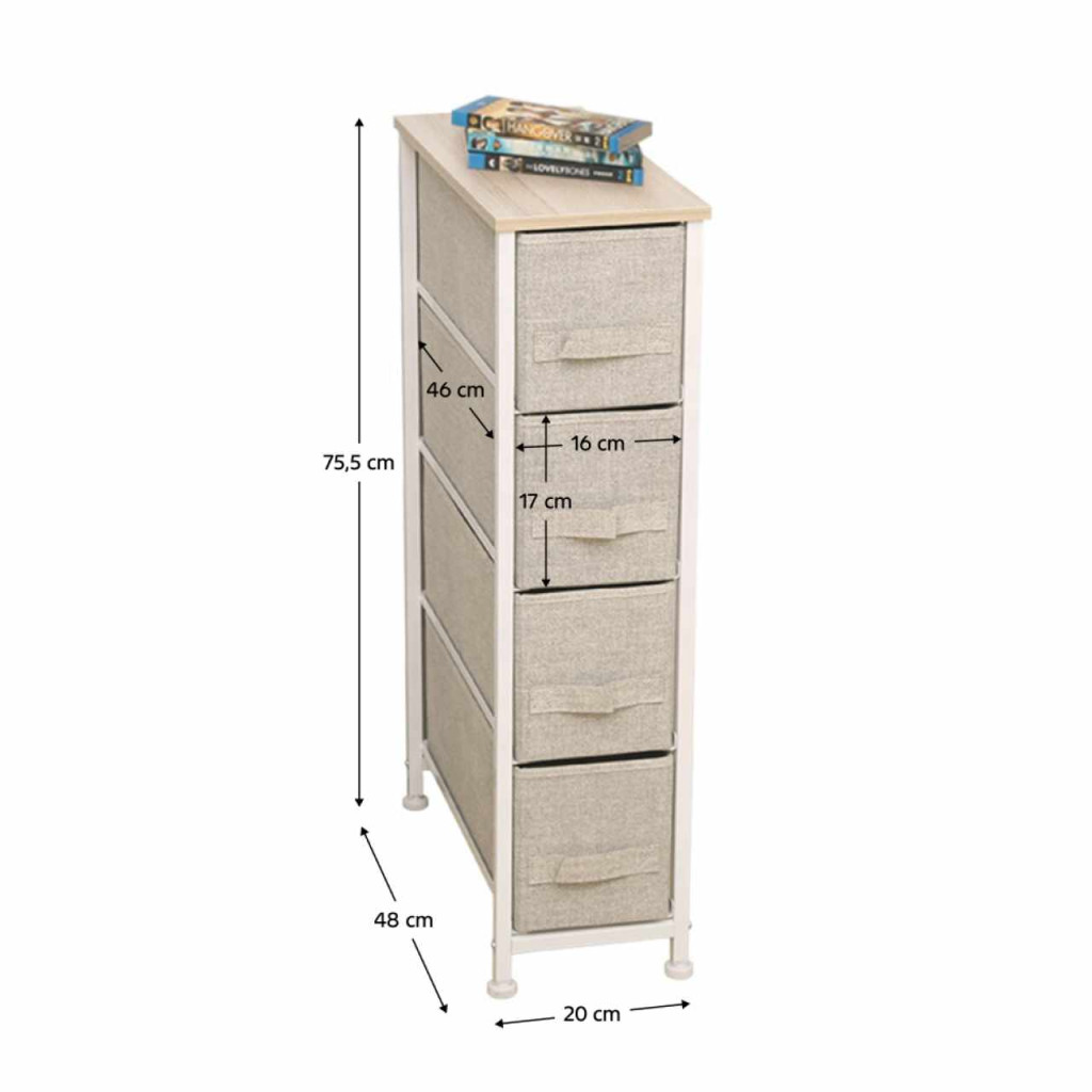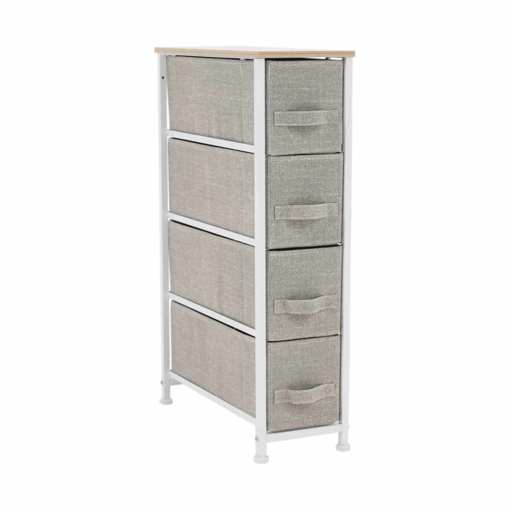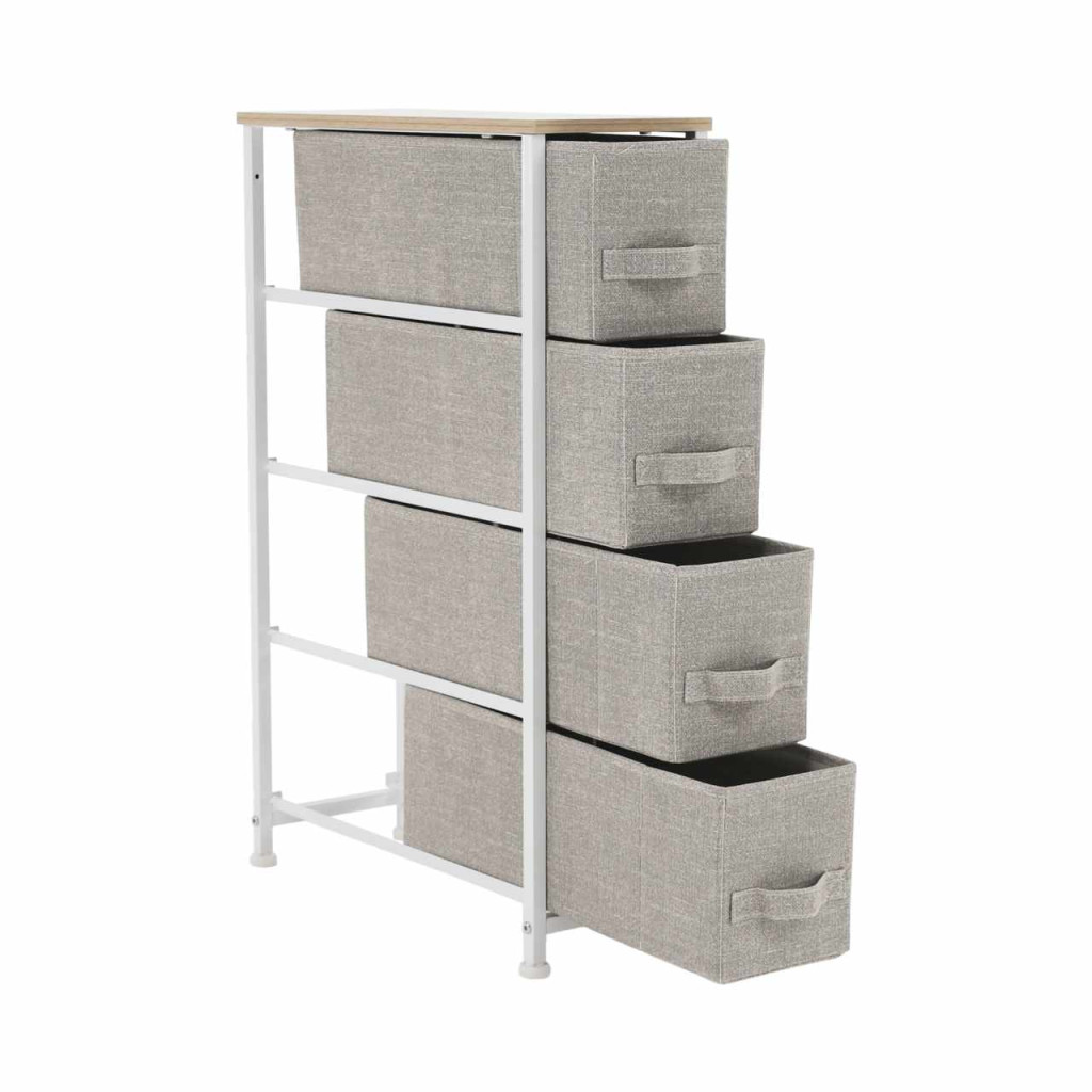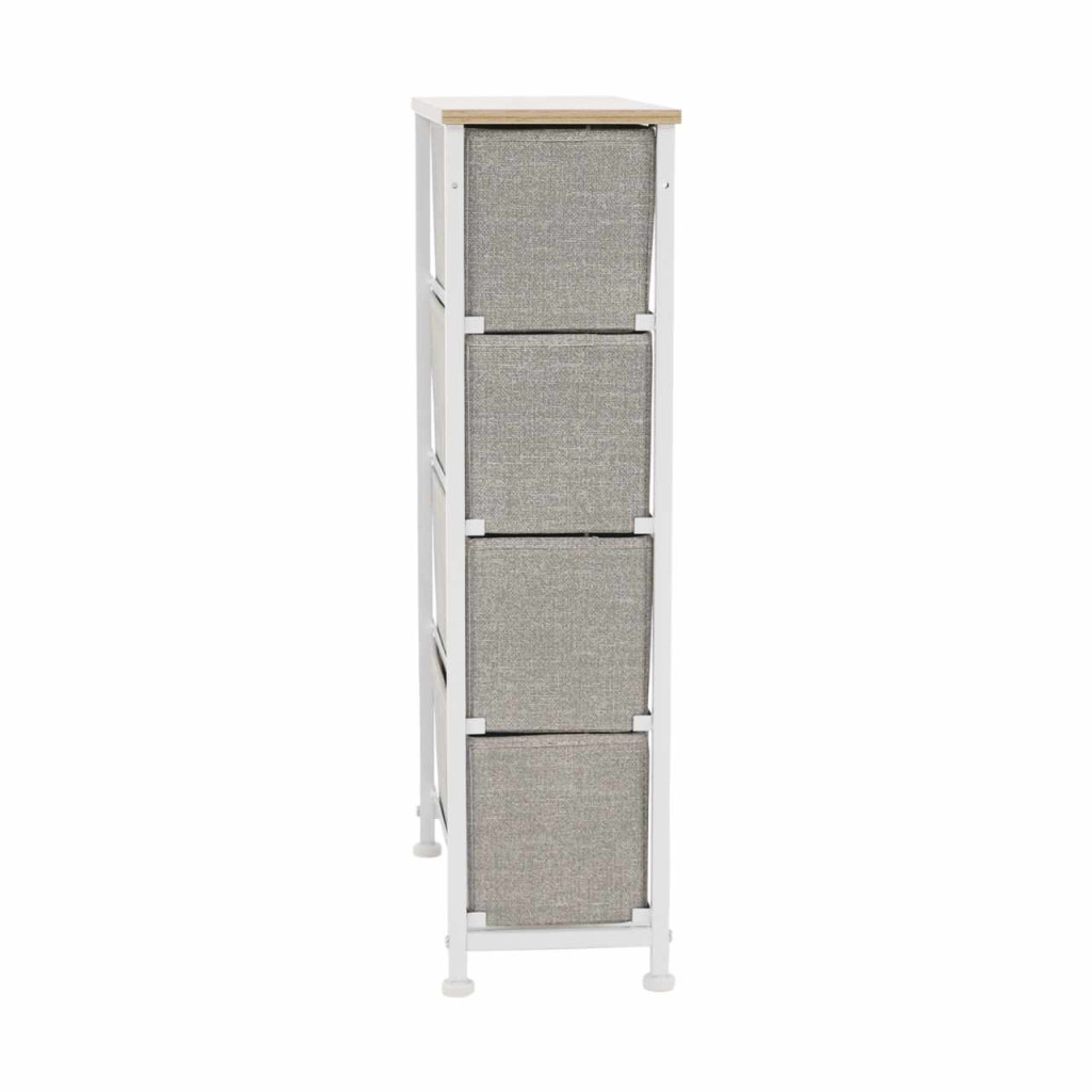 Anyag: MDF/fém/szövet Szín: világosszürke/fehér/bézs Méretek (SzxMéxMa): 20x48x75,5 cm Fiók méretei (SzxMéxMa): 16x46x17 cmNégy fiók Fém szerkezet Szövet fiókok Fogantyúkkal Szétszerelve szállítjuk