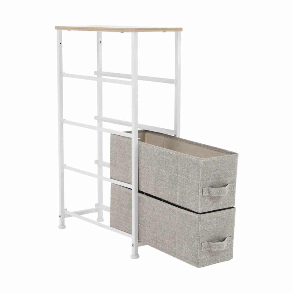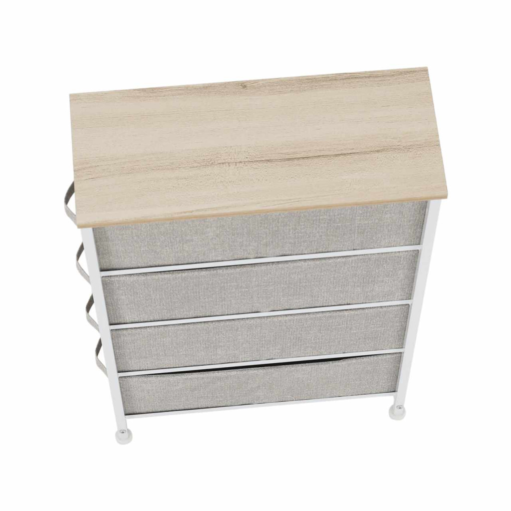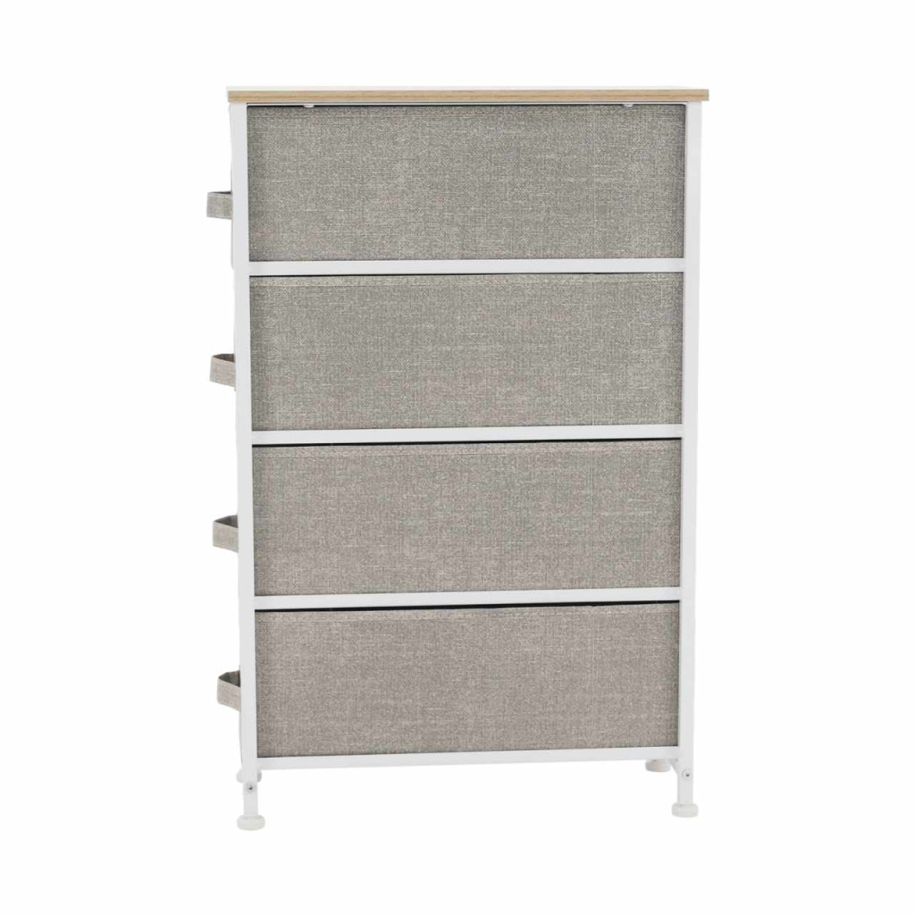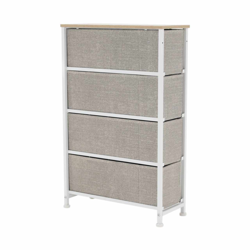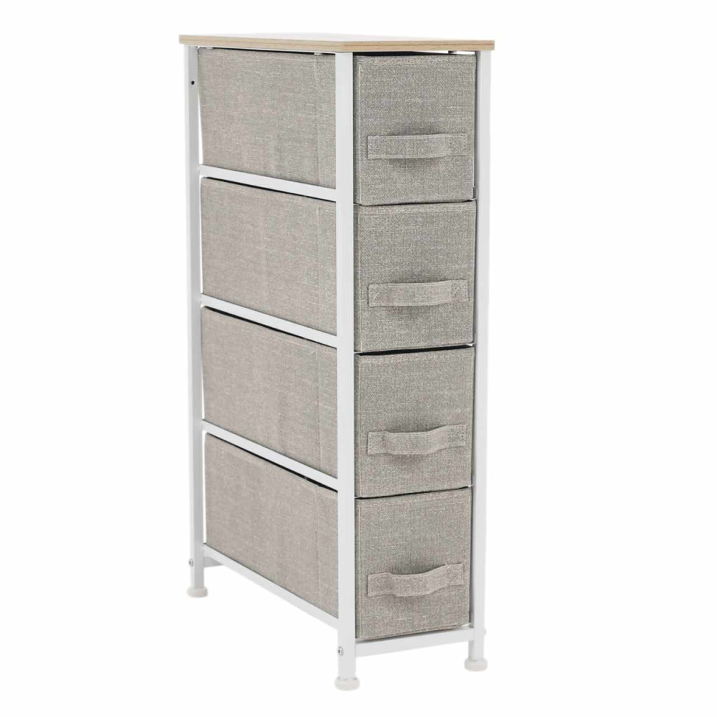 Anyag: MDF/fém/szövet Szín: világosszürke/fehér/bézs Méretek (SzxMéxMa): 20x48x75,5 cm Fiók méretei (SzxMéxMa): 16x46x17 cmNégy fiók Fém szerkezet Szövet fiókok Fogantyúkkal Szétszerelve szállítjuk