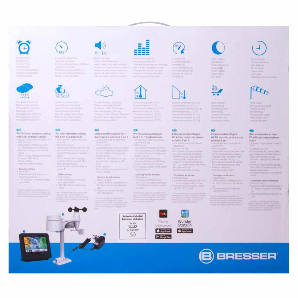 Bresser 5-in-1 Wi-Fi Weather Station with Color Display offers comprehensive information service despite its compact design. The multifunctional professional outdoor sensor can be easily installed with the supplied mounting accessories!