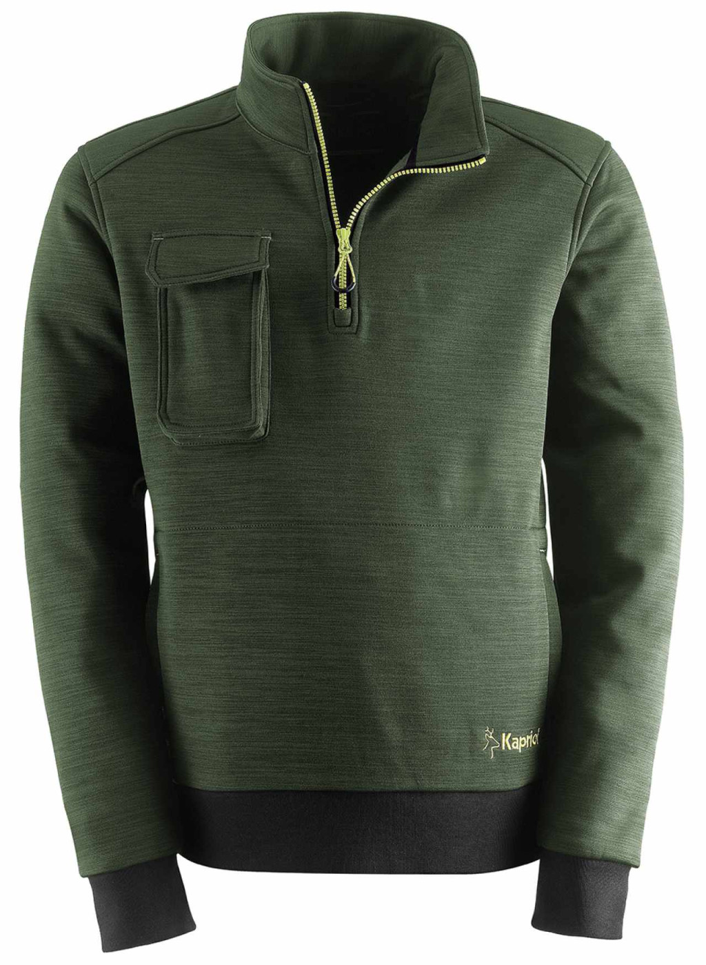 A KAPRIOL márka a professzionális igényeket kielégítő ruházati kiegészítők széles választékát kínálja.- Fél cipzár- Puha, meleg és kényelmes belső béléssel- Derék zsebek- Gumis anyag a pulóver alsó részén és az ujjak végén- Telefonzseb a mellkason- Anyag : 100% poliészter