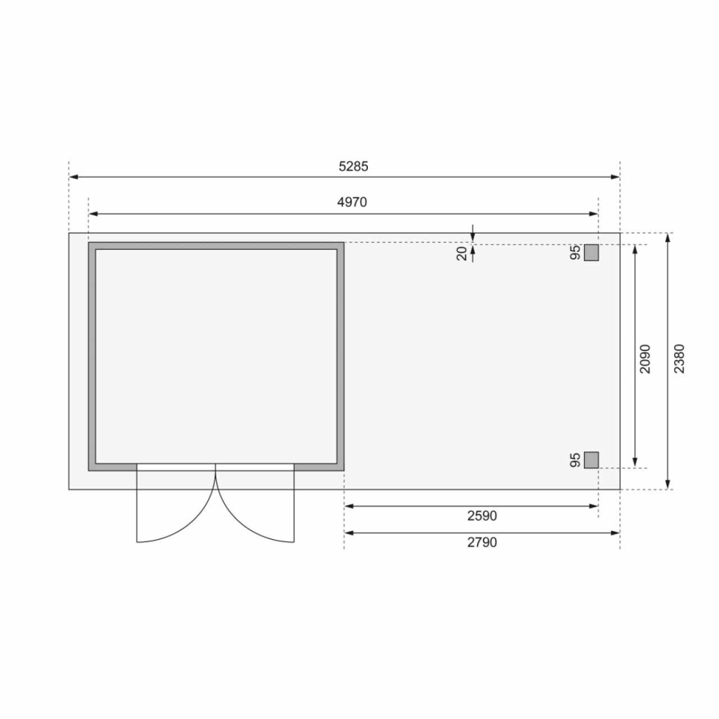 A kertes ház ezen változata tartalmaz egy 280 cm hosszú menedéket, amely jobbra vagy balra szerelhető.