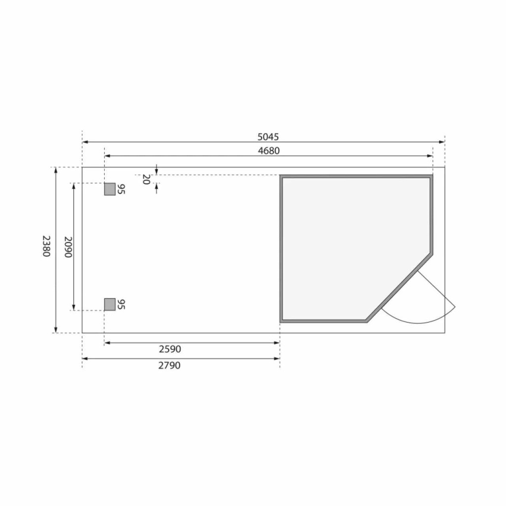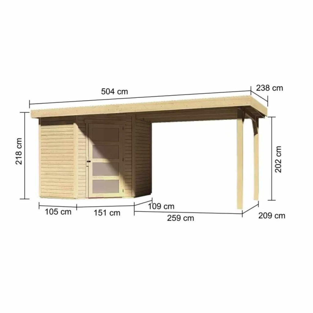 Sarokfaház alapmodellje kertjébe. Ez a modell lapostetővel és egyszárnyú csuklós ajtókkal rendelkezik. A ház építőanyaga 19 mm vastag, északi lucfenyőből tökéletesen mart faprofil. Bontott állapotban készletben szállítjuk, ahol a falak egyedi faprofilokból készülnek, amelyeket egyszerűen össze kell rakni és összecsavarozni. Ez garantálja a rendkívül egyszerű összeszerelést, amelyet bármely barkácsoló meg tud kezelni.