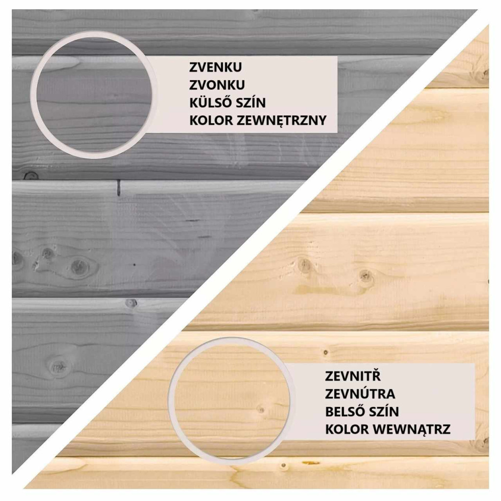 Ezt a házmodellt professzionális KARIBU festékkel (világosszürke árnyalat RAL 360 60 05) szállítjuk:
