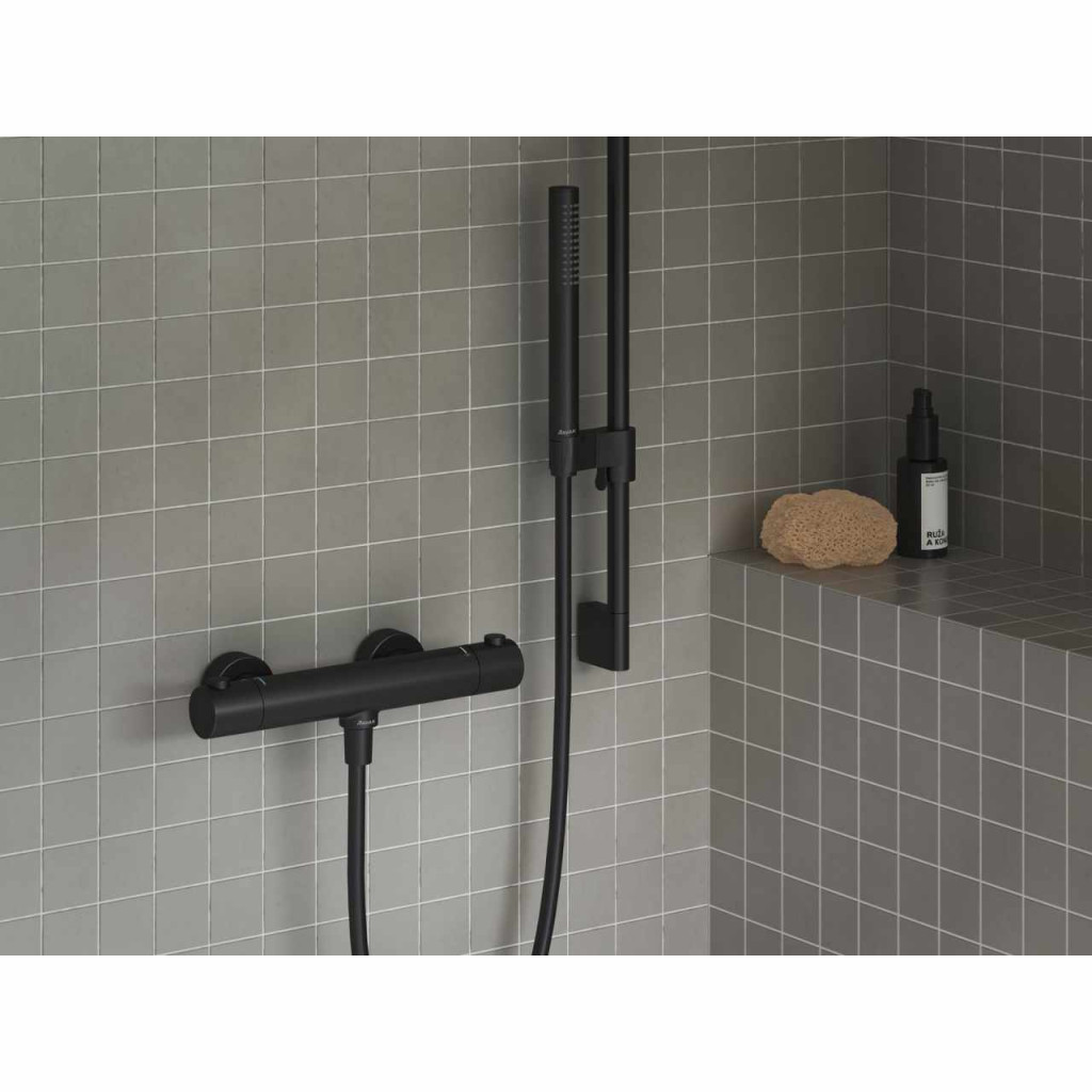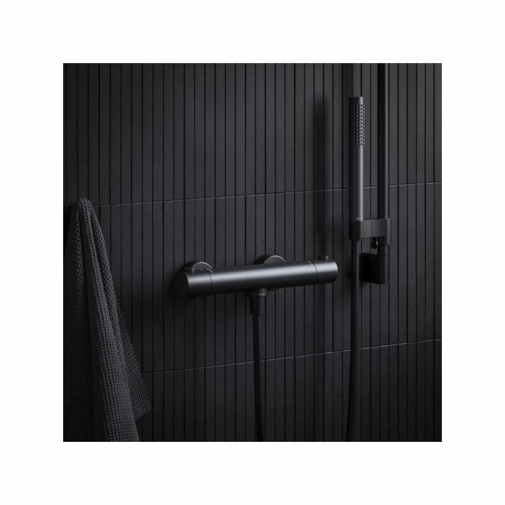 Puri termosztátos falra szerelhető zuhanycsaptelep, zuhanykészlet nélkül. Matt fekete kivitelben. Állandó vízhőmérséklet beállítása.