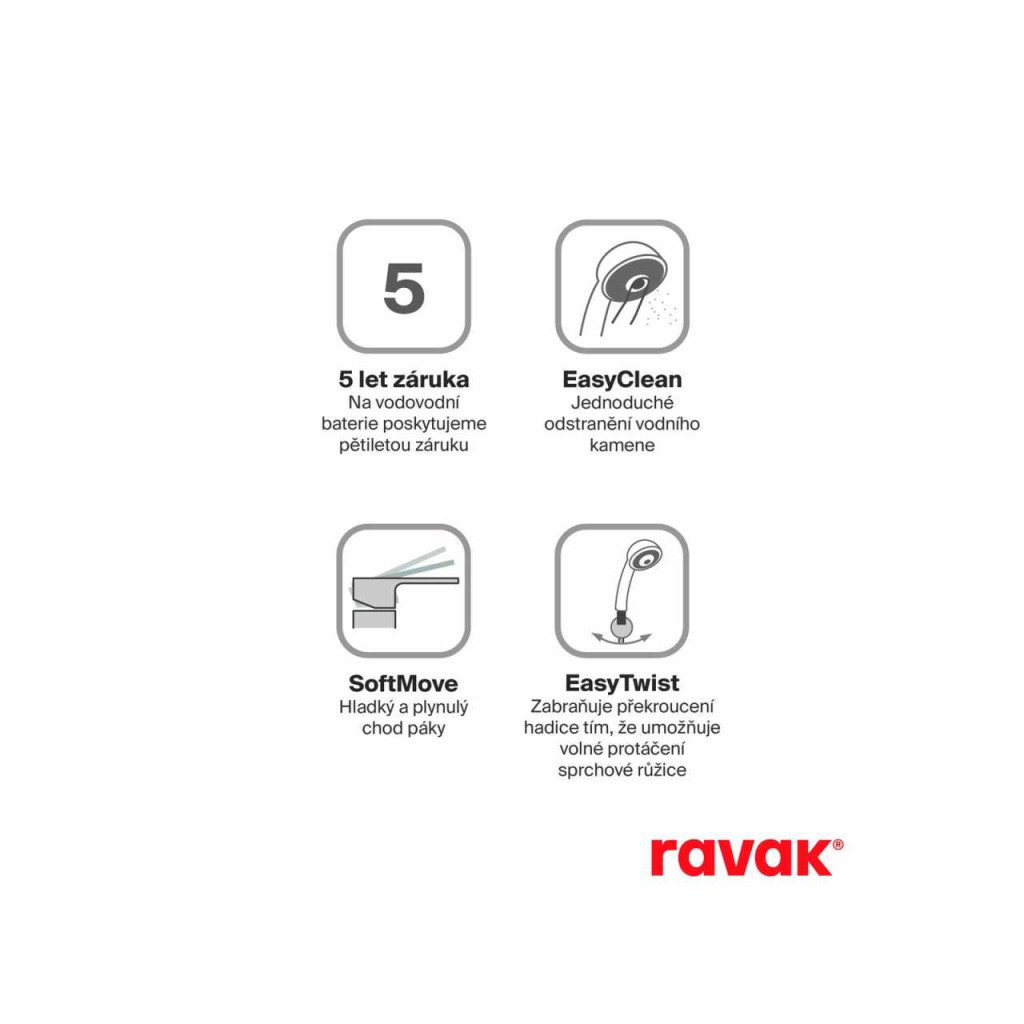 A zuhanykészlettel ellátott beépített csaptelep (tömlő és kézi zuhany) készen áll az R-box telepítőtest használatára, amely jelentősen megkönnyíti a munkát és javítja a teljes munka eredményét. Az egységes megoldás és a fürdőszoba design összhangjának érdekében javasoljuk, hogy kombinálja az Eleganta csaptelepekkel azonos színű kivitelben. A külső tisztításhoz javasoljuk a Ravak Cleaner Chrome tisztítószert.