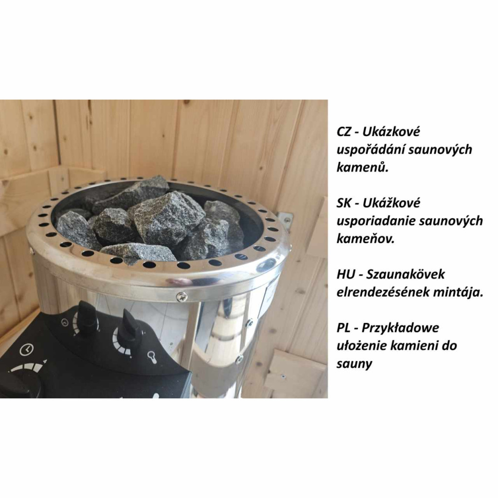• 18 kg szaunakövet tartalmaz (a csomag lényegesen több követ tartalmaz, mint amennyi a kályha kezdeti feltöltéséhez szükséges, a többi a repedt kövek későbbi cseréjére szolgál)