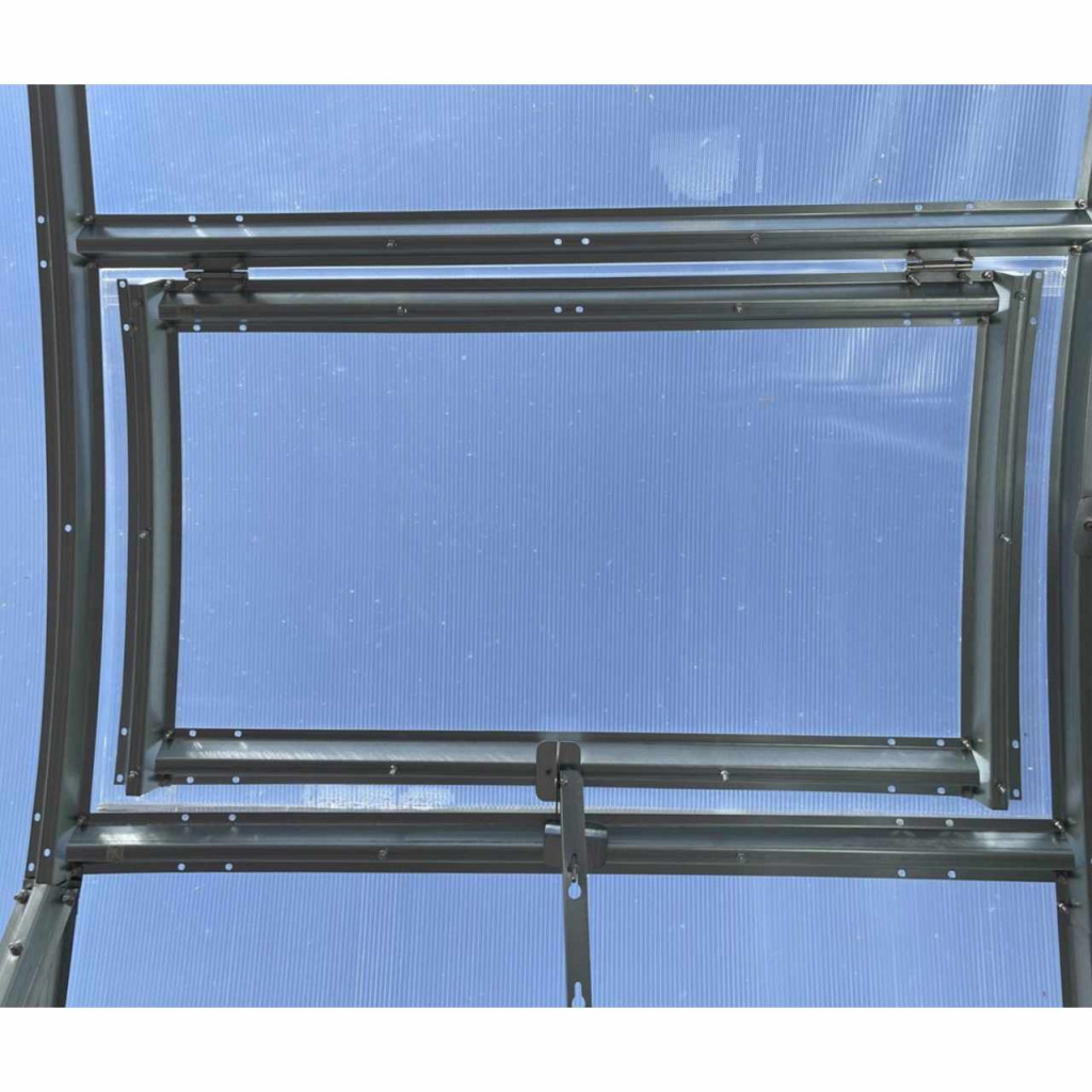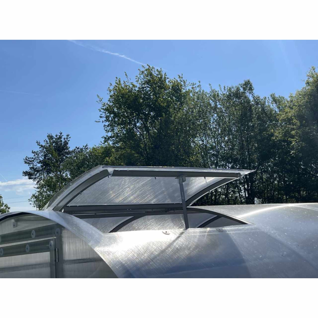 Egyszárnyú tetőszellőzőablak, mérete 0,60 x 0,95 m. Az ablakszerkezet 0,6 mm vastagságú és 55 mm szélességű horganyzott acélprofilokból készül. A tetőablak üvegezéseként az üvegház héjából az ablak helyén kivágott polikarbonát lemezt használják. Az ablak manuálisan zárható nyitott vagy zárt helyzetben. Javasoljuk, hogy vásároljon automata nyitót kínálatunkból, amely jelentősen növeli és leegyszerűsíti a szellőztetés kényelmét. Az automatikus ablaknyitó a környezeti hőmérséklettől függően nyílik és zár. Mindig az összeszerelési utasításoknak megfelelően szerelje össze.