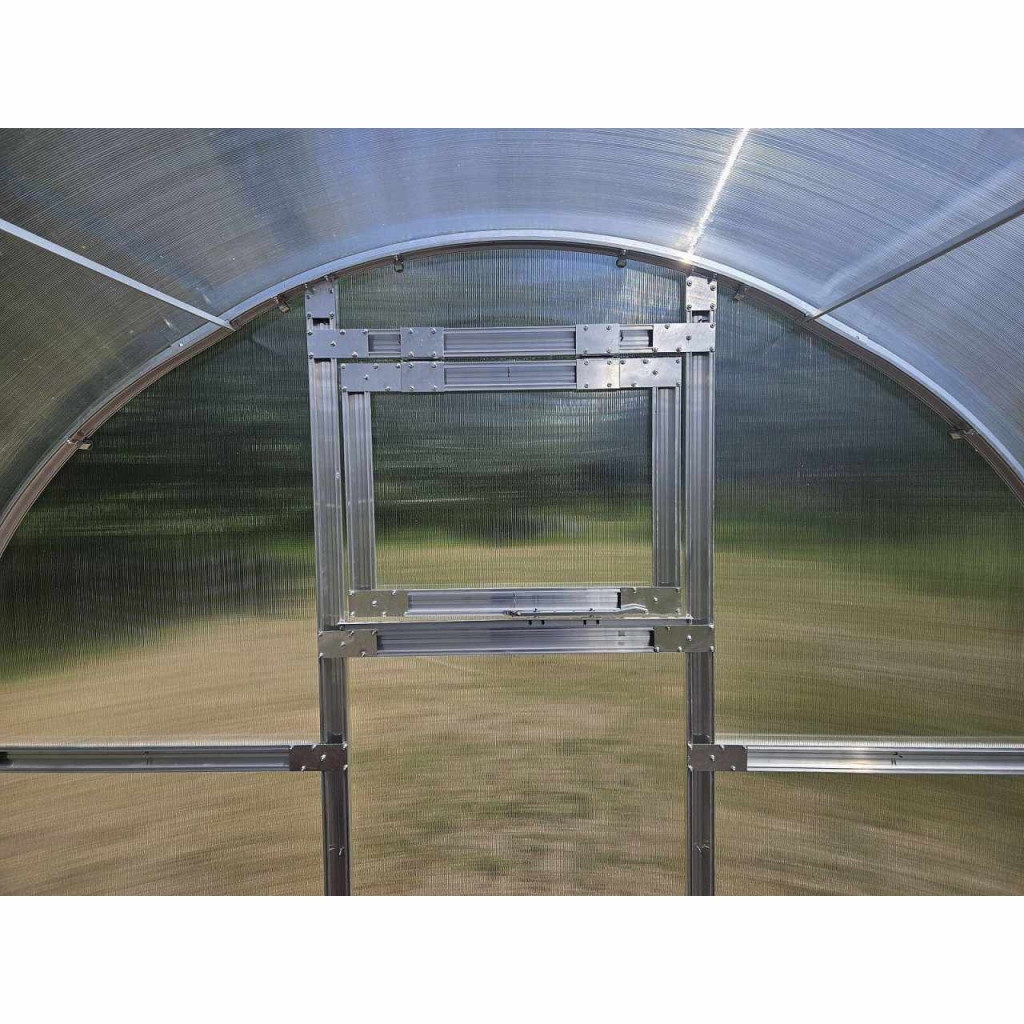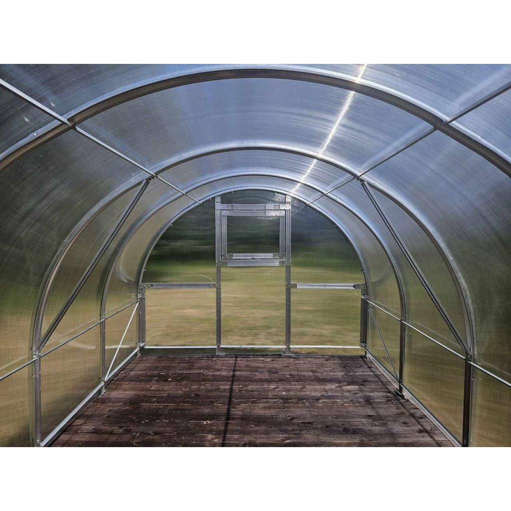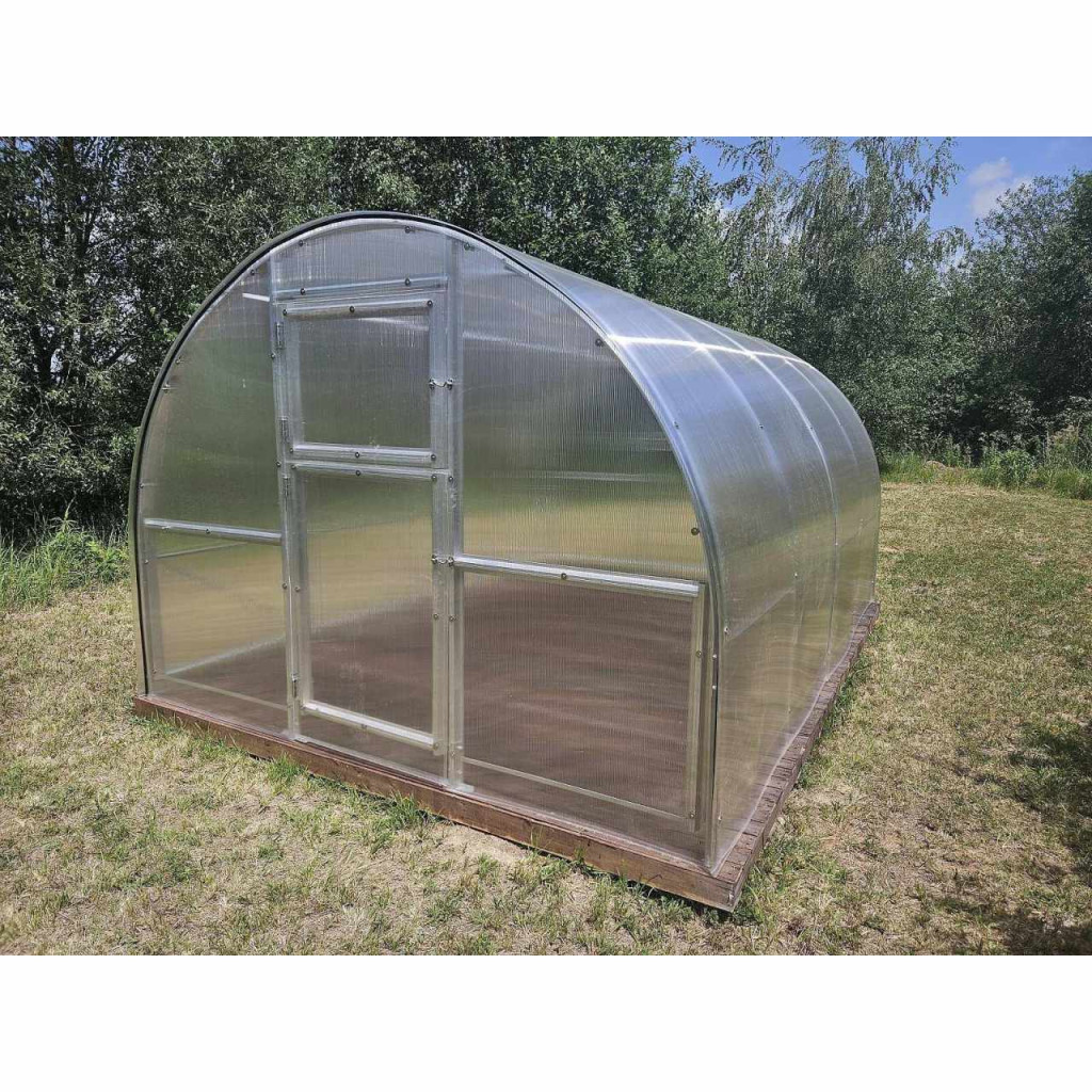 | szélessége 2,9 m, hossza kb. 4 / 6 / 8 m, masszív 1 mm vastag és 65 mm széles eloxált alumínium profil, ívtávolság 100 cm, íves szerkezet belső tartói, elöl dupla ajtók, hátul szellőző ablak, üvegezés. ki kell vágni a mellékelt polikarbonát lapokból |