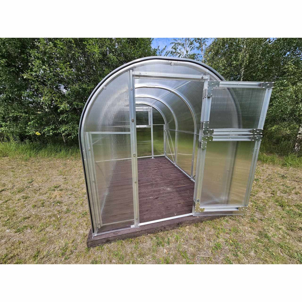 | szélessége 2,9 m, hossza kb. 4 / 6 / 8 m, masszív 1 mm vastag és 65 mm széles eloxált alumínium profil, ívtávolság 100 cm, íves szerkezet belső tartói, elöl dupla ajtók, hátul szellőző ablak, üvegezés. ki kell vágni a mellékelt polikarbonát lapokból |