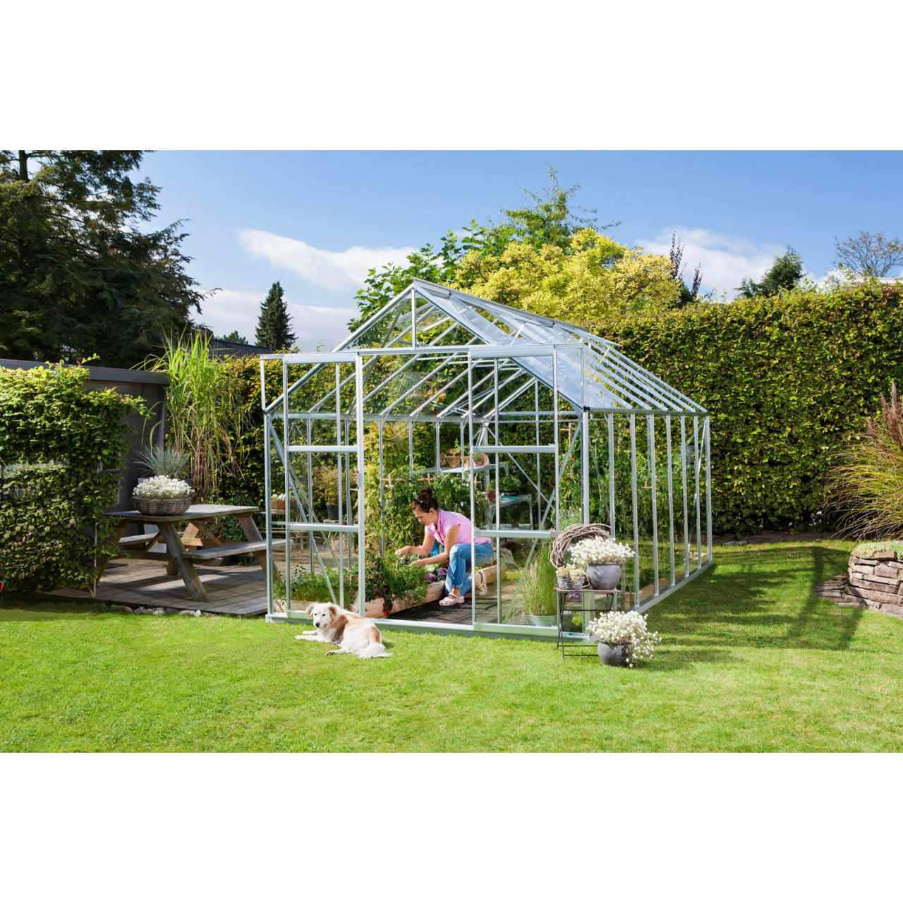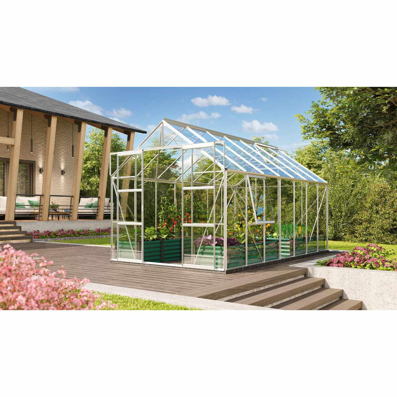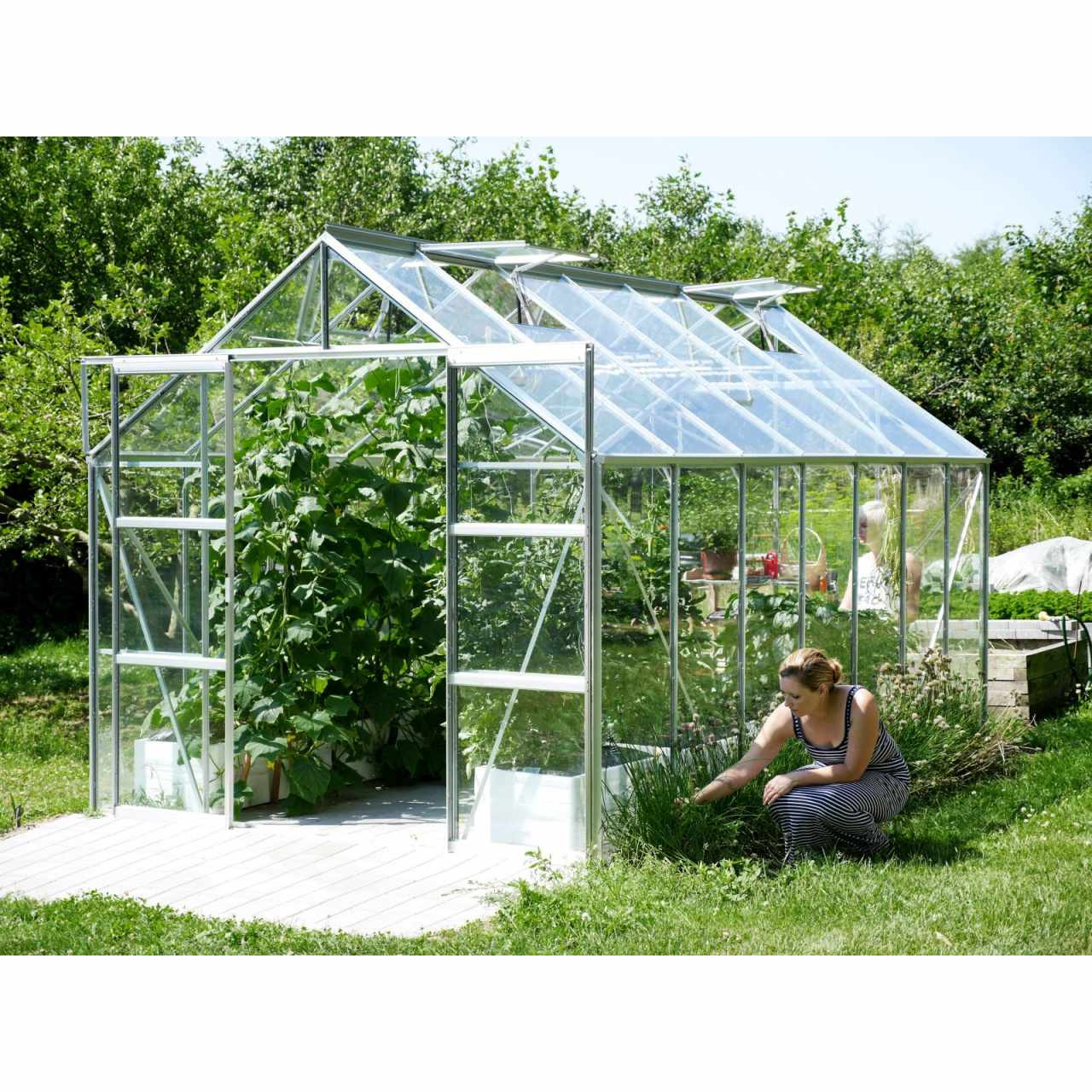 A csomag tartalma: kétszárnyú tolóajtó (nyílás mérete: sz 1,22 x ma 1,91 m), alumínium profilok, üvegezés, 4x db tetőszellőző ablak manuális nyitással, valamint minden szükséges rögzítő anyag. Az üvegház építhető például tégla alapra vagy horganyzott lemezből készült alapra. Alap nélküli építés esetén az alap vásárlását javasoljuk. Az üvegházhoz számos extra kiegészítő vásárolható, például polcok, állványok, további tető- és oldalsó szellőzőablakok, automatikus nyitók ezekhez az ablakokhoz, ereszcsatorna készletek, hőmérők és páramérők. Az üvegezés nem visszaváltható faládába van csomagolva.