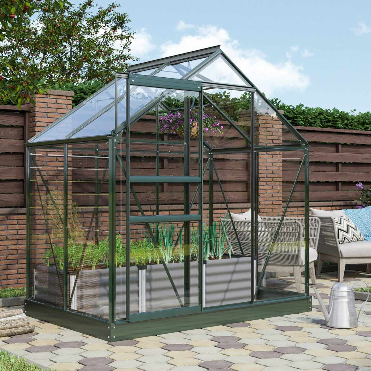 A csomag tartalmaz egyszárnyú tolóajtót (sz x ma = 0,61 x 1,61 m), AL profilokat, üvegezést, 1x kézi nyitású tetőszellőző ablakot, minden összekötő anyagot. Az üvegház építhető például téglabélésre vagy horganyzott lemezből készült alapra. Alap nélküli építésnél mindenképpen javasoljuk a horganyzott alap kiegészítő beszerzését. Az üvegházhoz számos extra standard tartozék vásárolható - polcok, állványok, kiegészítő szellőzőtető és oldalsó ablakok, automata nyitók ezekhez az ablakokhoz, ereszcsatorna készletek, hőmérők, nedvességmérők. Az üvegházat készletben szállítjuk, részletes összeszerelési útmutatóval. Papír kartondobozba csomagolva. Az üvegezés nem visszaváltható faládába van csomagolva.